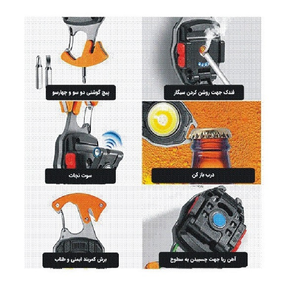 ت این چراغ قوه یک فندک تبیعه شده است که با فشردن دکمه مربوط به فندک و نگه داشتن دکمه، فندک شروع به قرمز شدن می کند و با برداشتن دست از روی دکمه فندک خاموش می شود. این چراغ قوه چند کاره دارای سوت نجات و همچنین تیغ طناب بر که در مواقع اضطراری می توان از آن استفاده کرد. این چراغ قوه 2 عدد پیچ گوشتی نیز دارد. که می توان سری پیچ گوشتی مورد نظر را در سوراخ بالای چراغ قوه قرار داد و استفاده کرد. پشت چراغ قوه یک آهنربا وجود دارد که موقع کار می توان به سطوح فلزی متصل کرد و همچنین میتوان از درب بطری بازکن آن استفاده کرد .